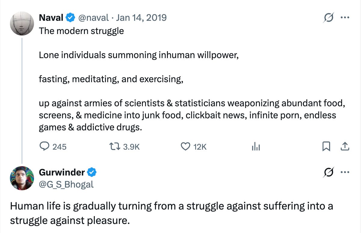 While Naval’s 2019 tweet is a bit melodramatic, it’s not wrong: the athleisure ape is increasingly exploited by the apes building the system. Emotional dysregulation rises as a result, which leaves people too tired and fatalistic to do what they say they want to do.