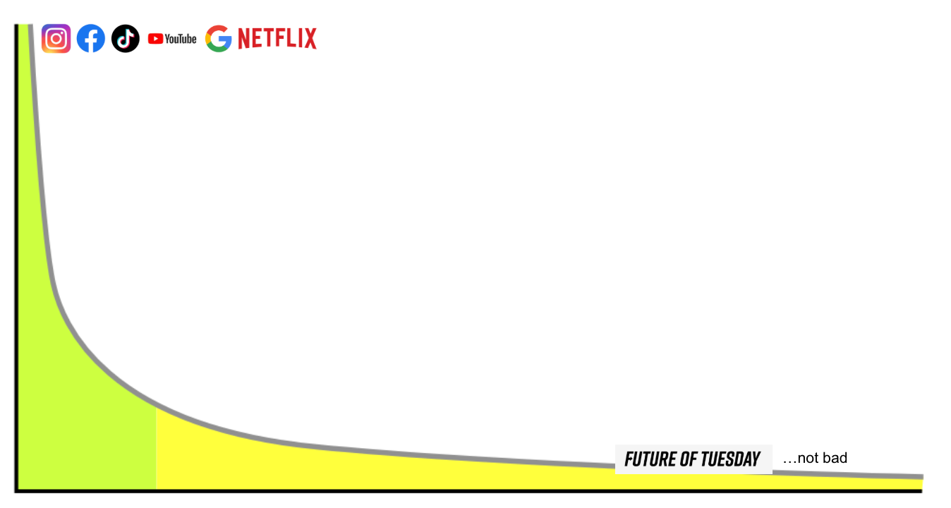 The very few winners in each space became known as “aggregators.”3 Human attention followed a power law, in which the overwhelming majority of attention clustered to these aggregators, followed by an infinitely “long tail” of sites (like mine) that comprise a sliver of online attention.