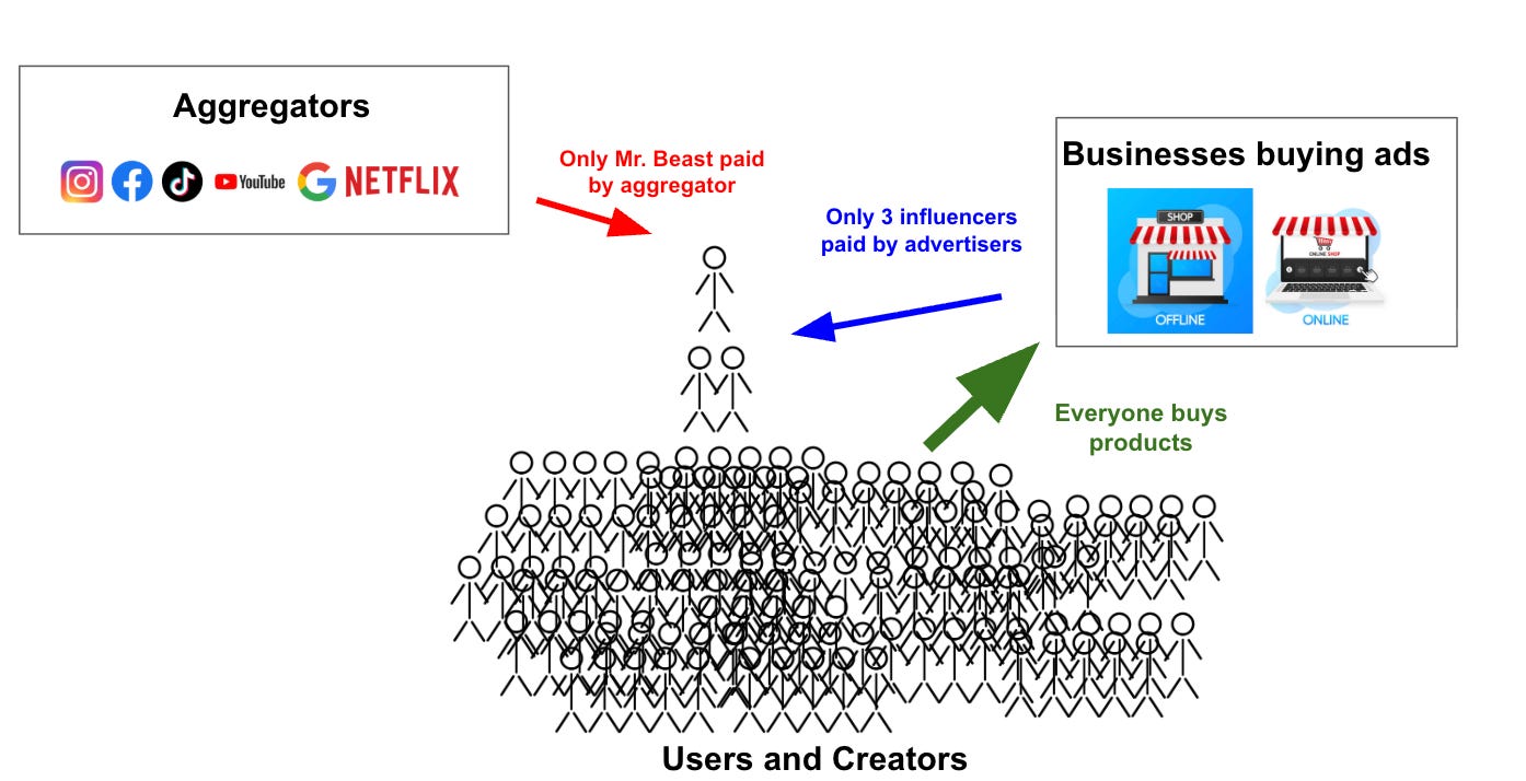 When distribution constraints died, attention power laws took their place. For the aggregators, selling ads in front of an audience of billions of people without paying 99% of their non-Mr.-Beast content creators became the greatest business model of all time.4